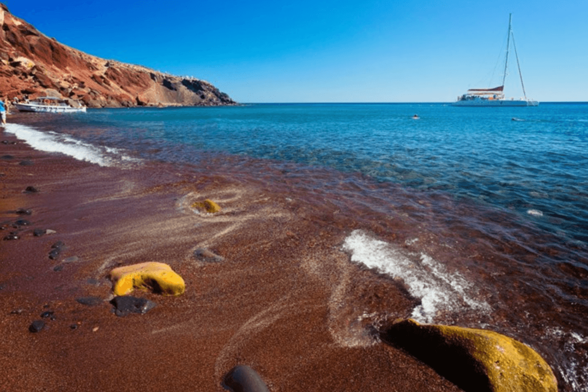 Red Beach Santorini with striking red cliffs and clear turquoise sea.