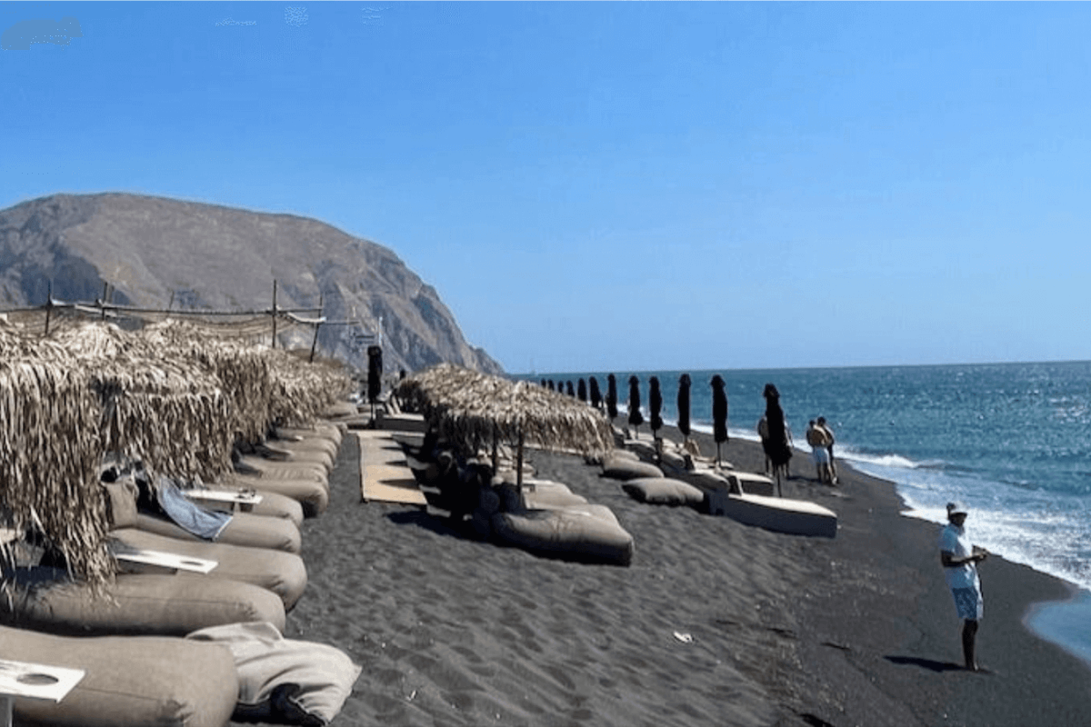 Kamari Beach Santorini with black sand and clear blue water under a sunny sky.